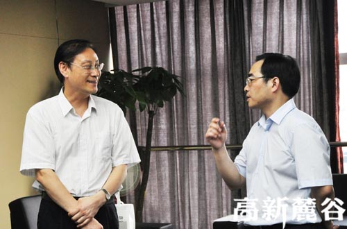 (石光明(左)正在和圣湘生物董事长戴立忠(右)交流。吴梦珊 摄)