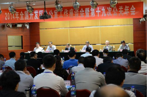 2014年9月28-29日,由中国开发区协会主办的2014年全国开发区办公室工作座谈会暨第十九次公关年会在西安举办。中国开发区协会会长师荣耀、陕西省商务厅副巡视员冯保安、西安经济技术开发区管委会巡视员段永和、中国开发区协会副秘书长张克勤、陕西省商务厅开发区处处长李亚荣出席了会议。来自全国60多家开发区100余名代表参加了会议。会议由中国开发区协会办公室主任张立刚主持。