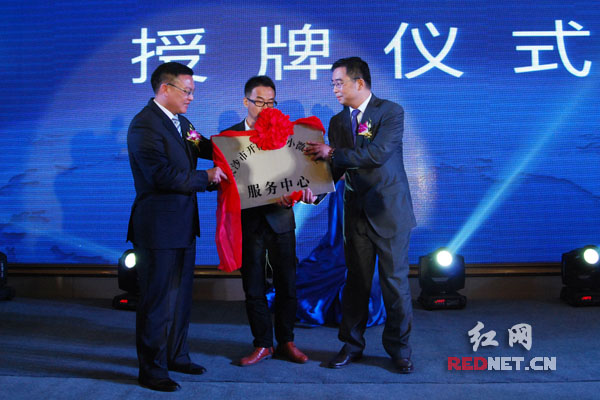 (“长沙市开福区中小微企业服务中心”授牌仪式上,长沙市开福区区委副书记沈裕谋为长沙佳海产业园建设投资有限公司总经理吴英勇授牌。)